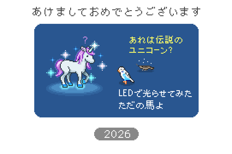と言うわけで、今年も年賀状を作りましたので、よろしかったら見てください。下の空欄はもうお約束、実際の年賀状にする時のコメント欄です。ちなみに元のドット絵はこちら。192×110ピクセルの65色です。