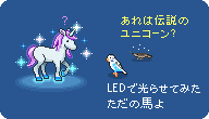 午年にあわせて馬をライトアップしたチョコ。キラキラした幻想的なその姿に「伝説のユニコーン」だと勘違いしたキャロラインですが、実際にはLEDでキラキラしているだけの「電飾のゲーミングホース」でした。