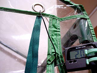 ケージの台として、植物用のビニール温室を使っている。これは、前面両側にファスナーがあるので、温度調節などに大変重宝している。